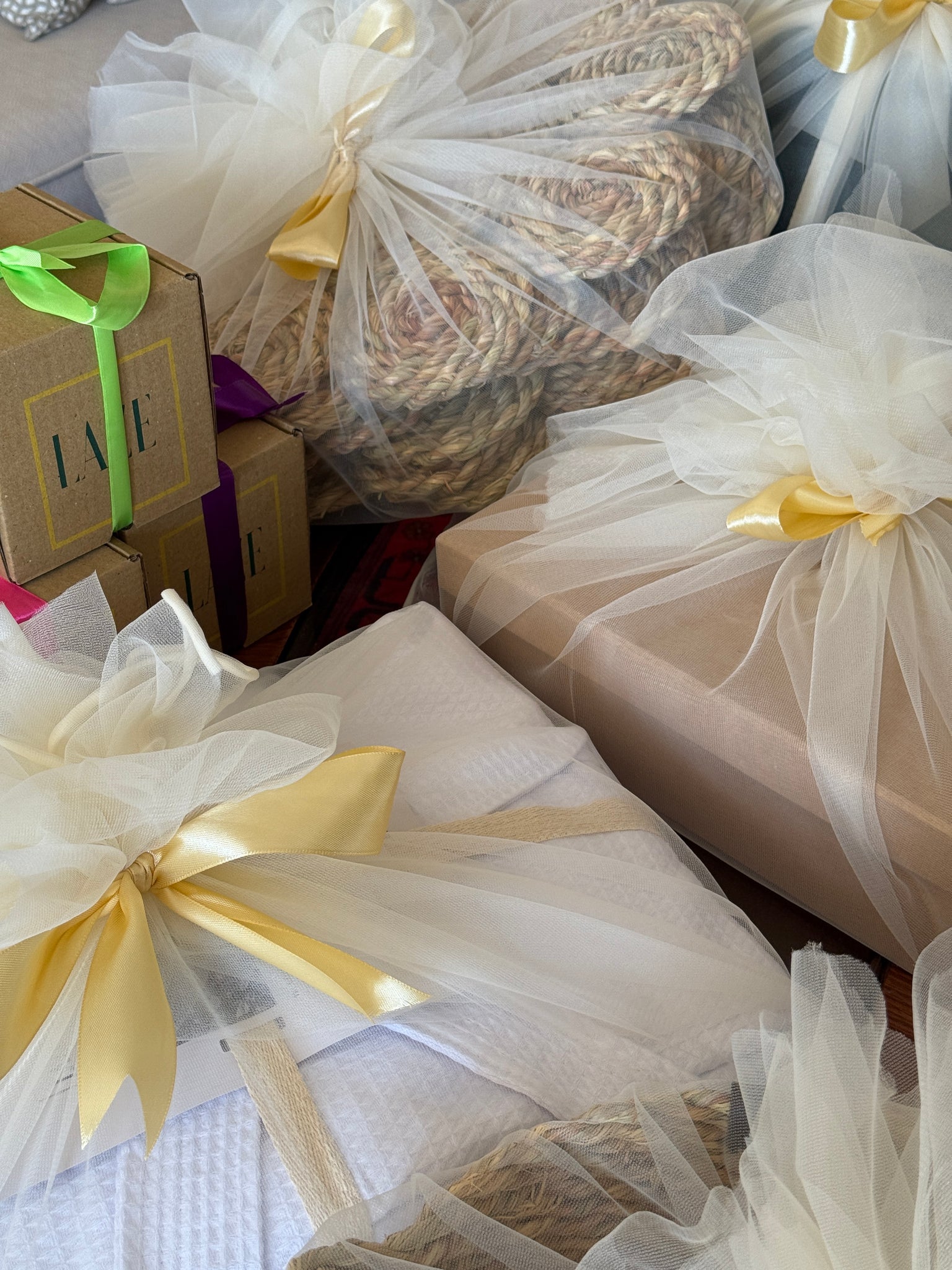 Wrap your gifts in timeless elegance with our exclusive bridal packaging. Each piece is carefully dressed in soft ivory tulle and finished with a golden satin bow, creating a dreamy presentation that feels both romantic and luxurious.