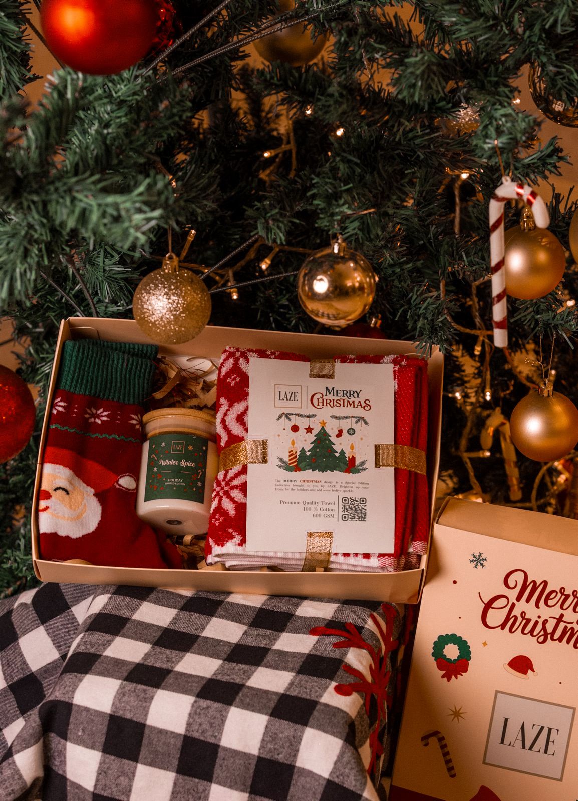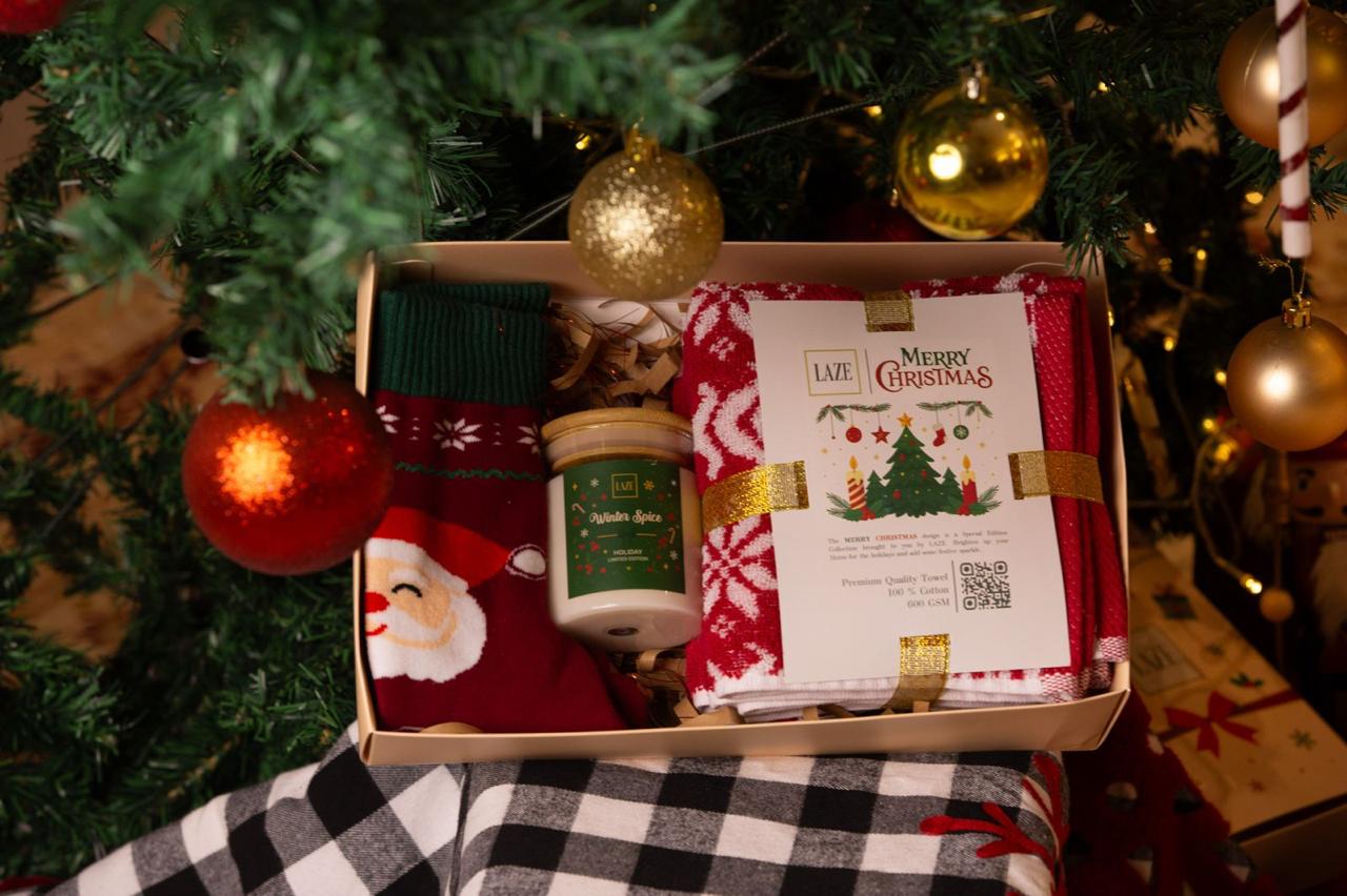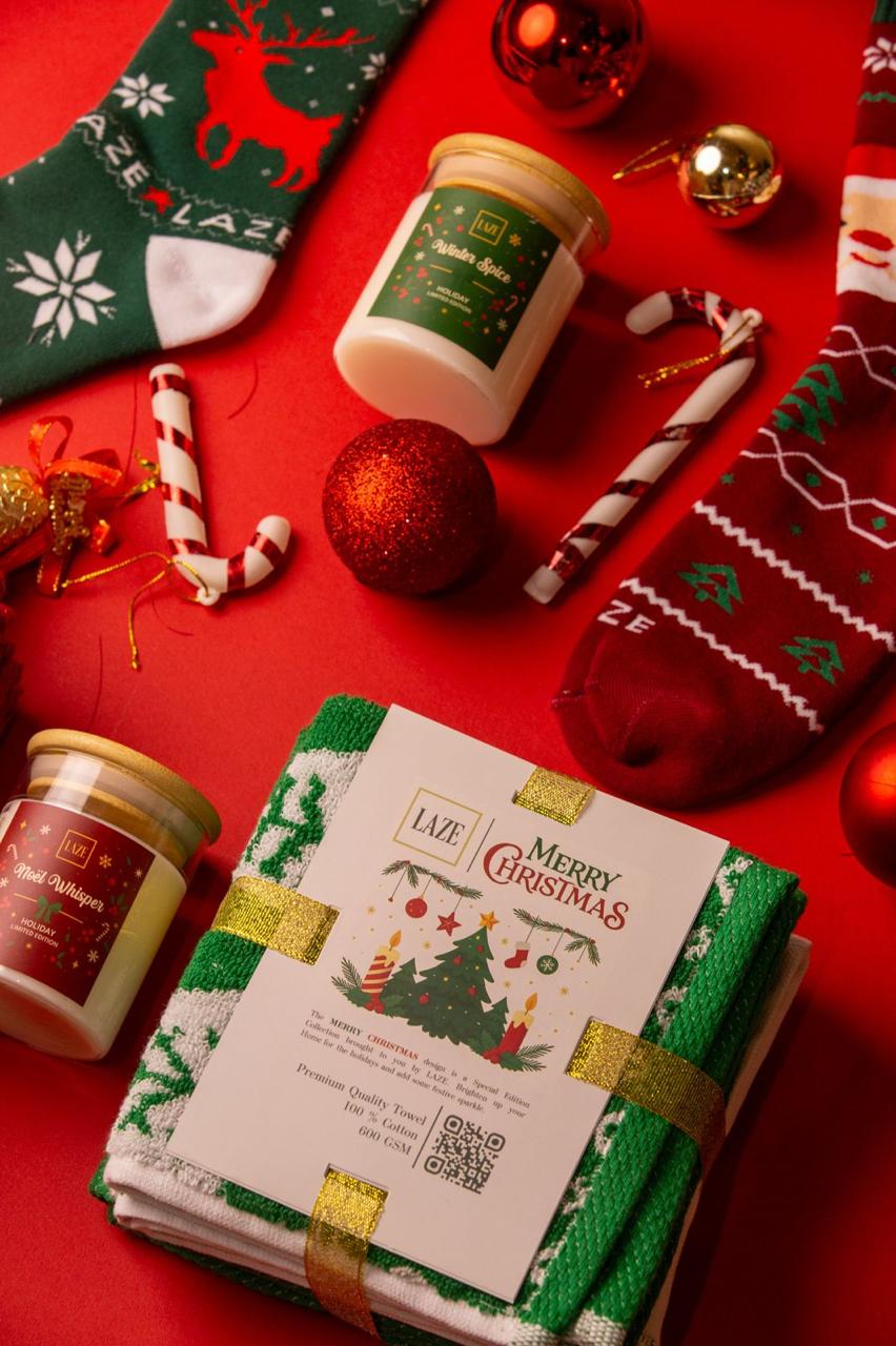 Celebrate the most magical season with The Christmas Collective Box by LAZE β a curated ensemble of softness, scent, and style. Inside, youβll find plush Egyptian cotton towels, a warm festive candle, and cozy socks β each crafted to embrace the true essence of Christmas comfort.